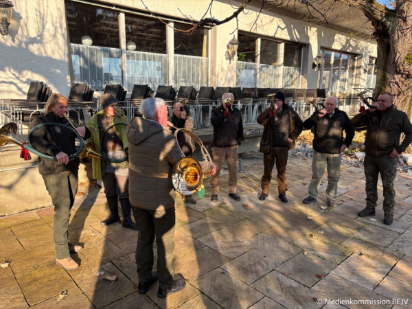 Nach den Prüfungen trafen sich alle Beteiligten im Restaurant Linde Belp, das auch dieses Jahr eigens für diesen Anlass seine Türen öffnete. Bei einem feinen Aser wurde nicht nur gegessen, sondern auch gefachsimpelt und gelacht. Anschliessend erklangen im Garten die Instrumente der Jagdhornbläser Hubertus Bern, die mit der traditionellen Hundefanfare den feierlichen Rahmen für die Bekanntgabe der Resultate schufen. René Kaiser, Prüfungsleiter stellte fest, dass die meisten Hunde hervorragend vorbereitet waren und er lobte die einwandfrei organisierte und bestens vorbereitete Prüfung. Auch Jacqueline Sitje lobte das hervorragende Revier im Wald, auf dem Feld und im Wasser.