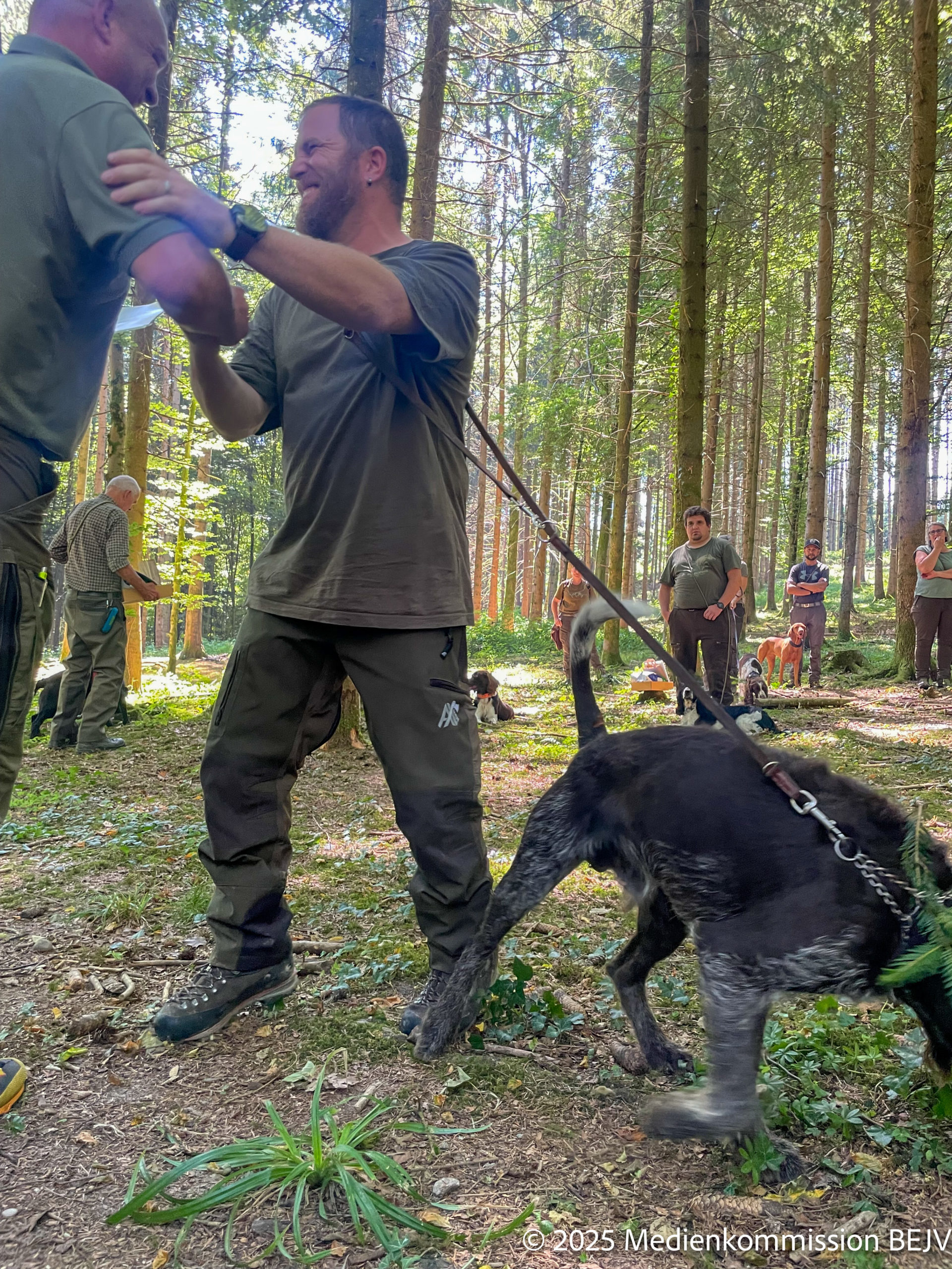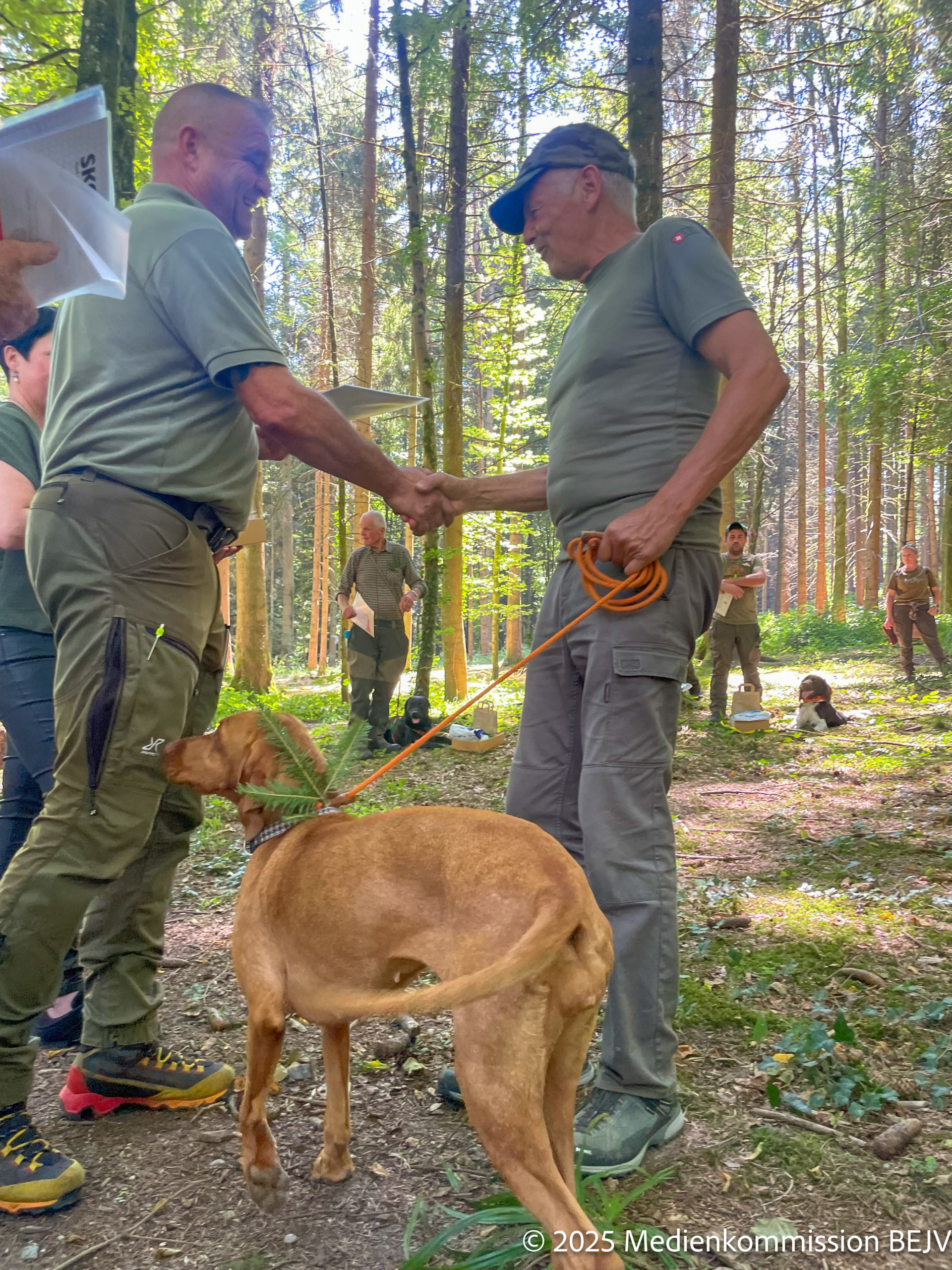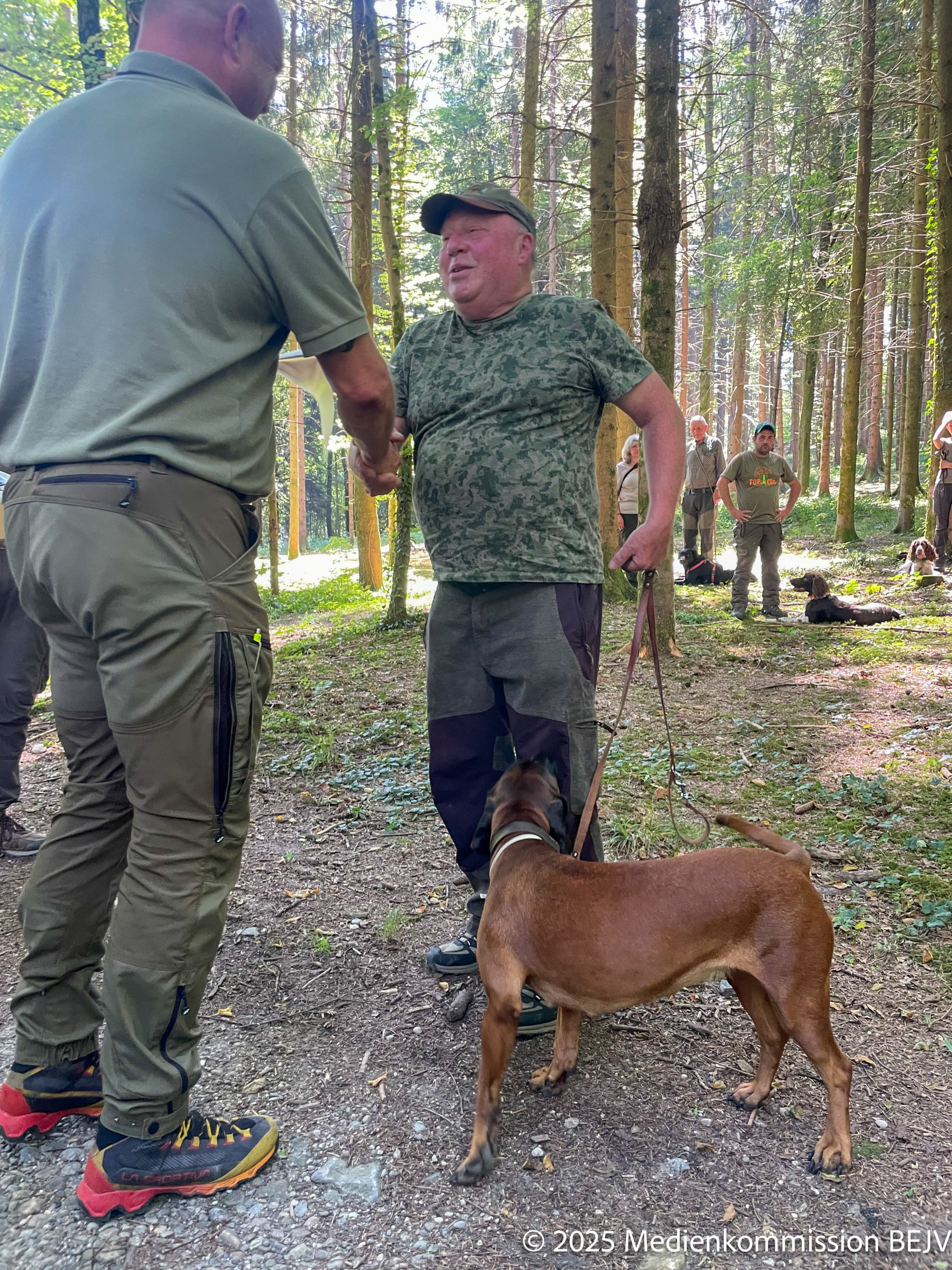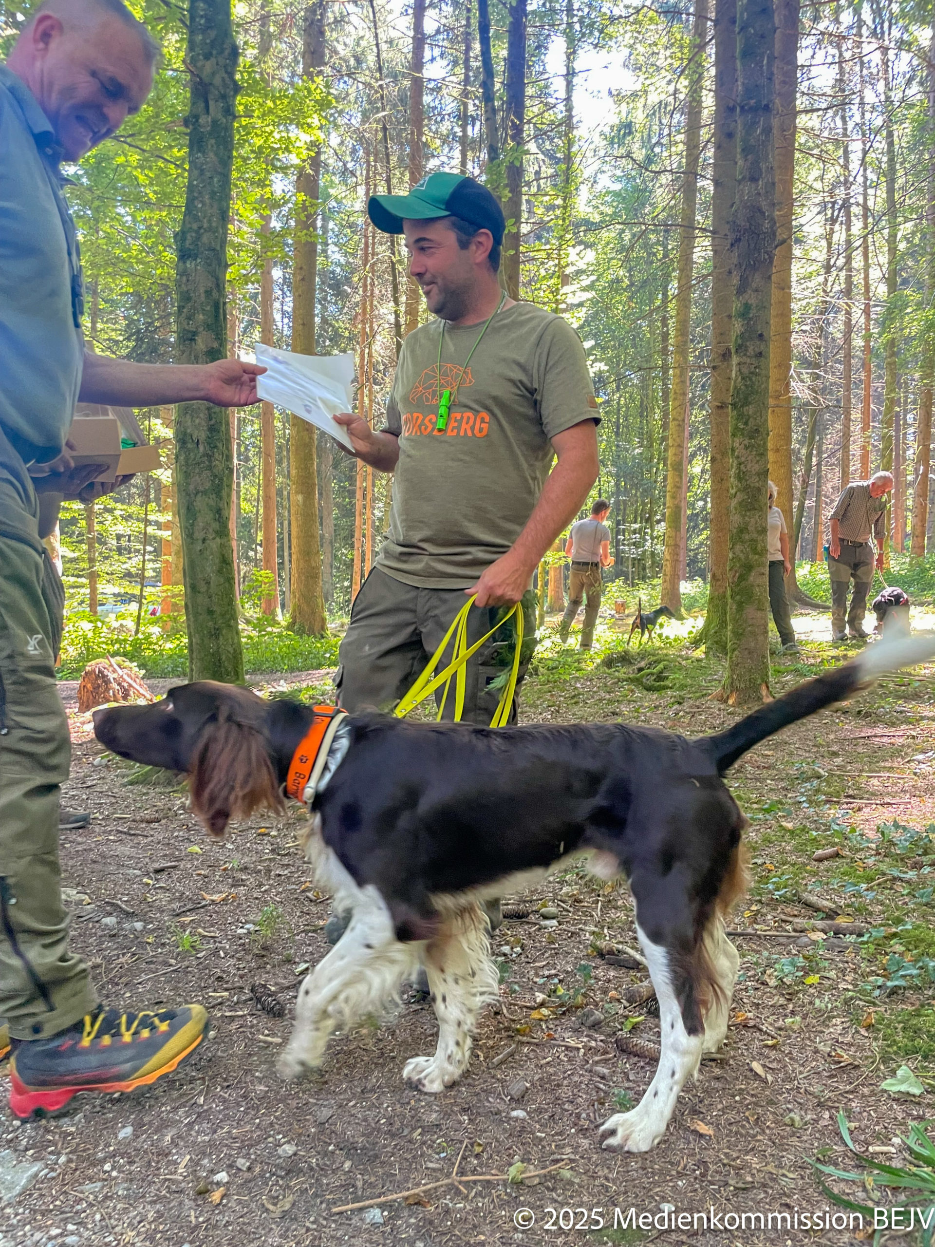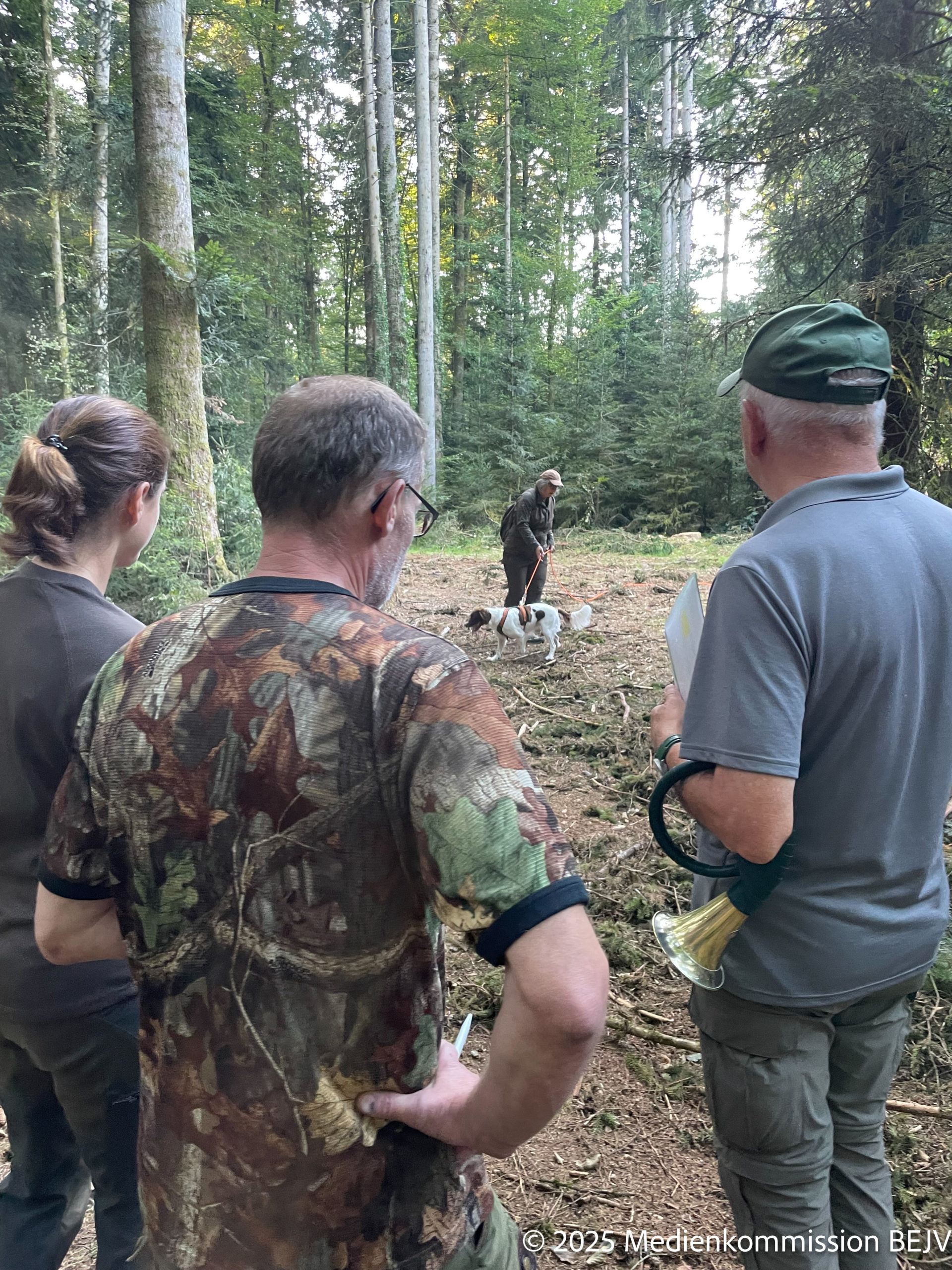 Innerhalb der Prüfungsgruppe haben die Richter anschliessend die elektronische Kennzeichnung (Mikrochip) geprüft und die Teilnehmenden verschoben in das Prüfungsgelände. Seit 2025 ist eine neue Prüfungsordnung für Schweisshundeprüfungen der Technischen Kommission für das Jagdhundewesen (TKJ) in Kraft. Unter anderem müssen die Gespanne neu eine Vorsuche auf einer markierten Fläche von ca. 30 x 30 m durchführen, wobei der Abgang selbst gefunden werden muss. Die Richterinnen und Richter haben lediglich eingewiesen und die ungefähre Richtung des abgehenden, verwundeten Stücks angegeben.