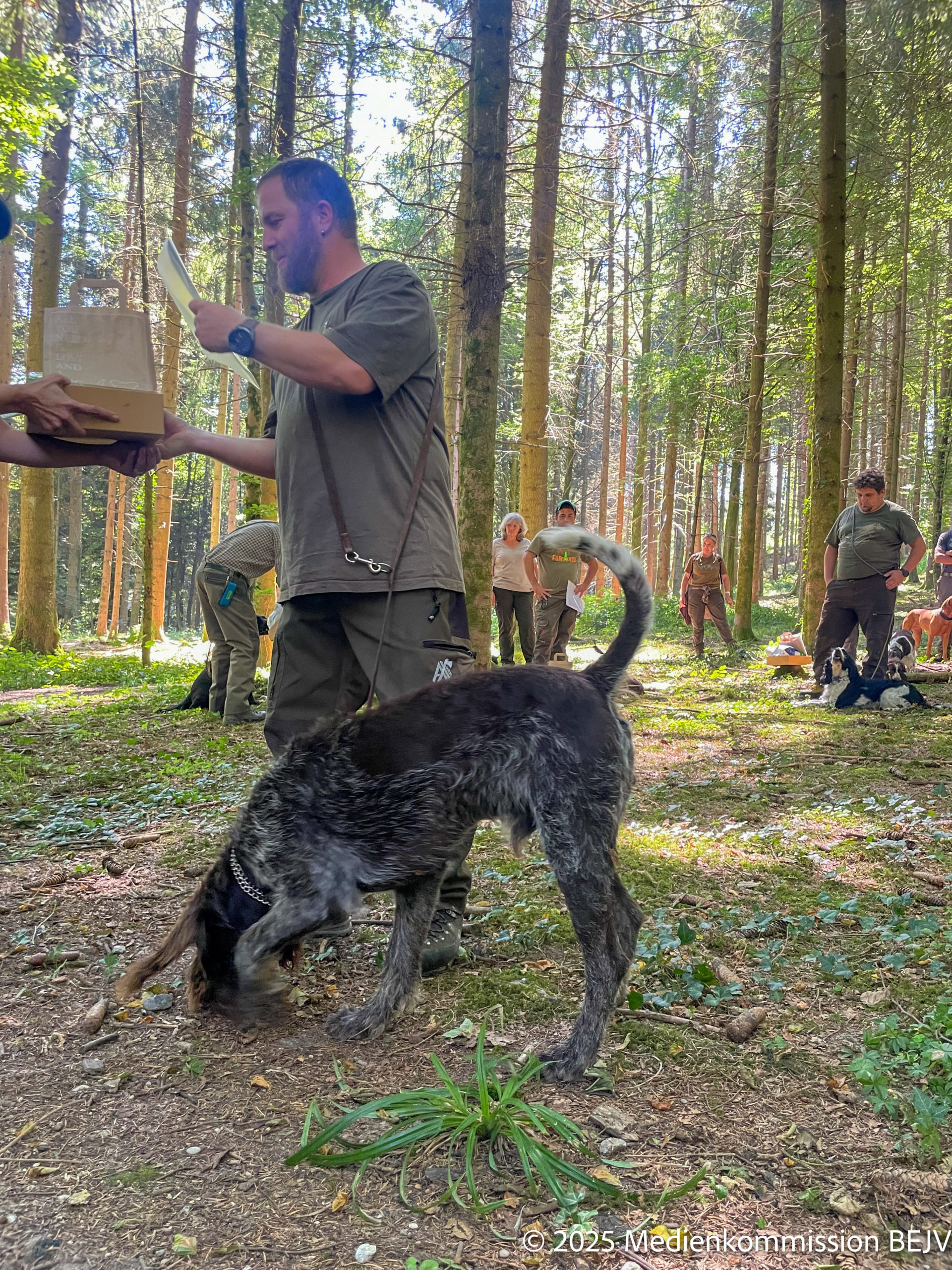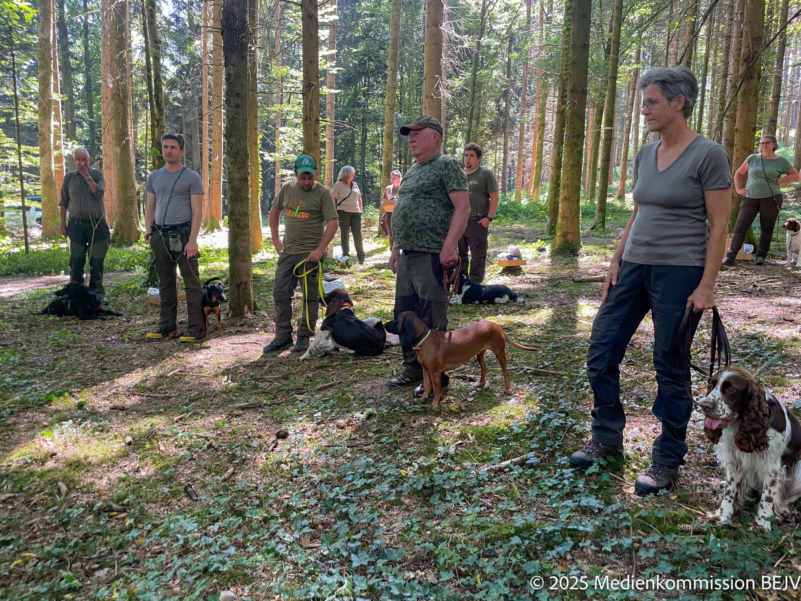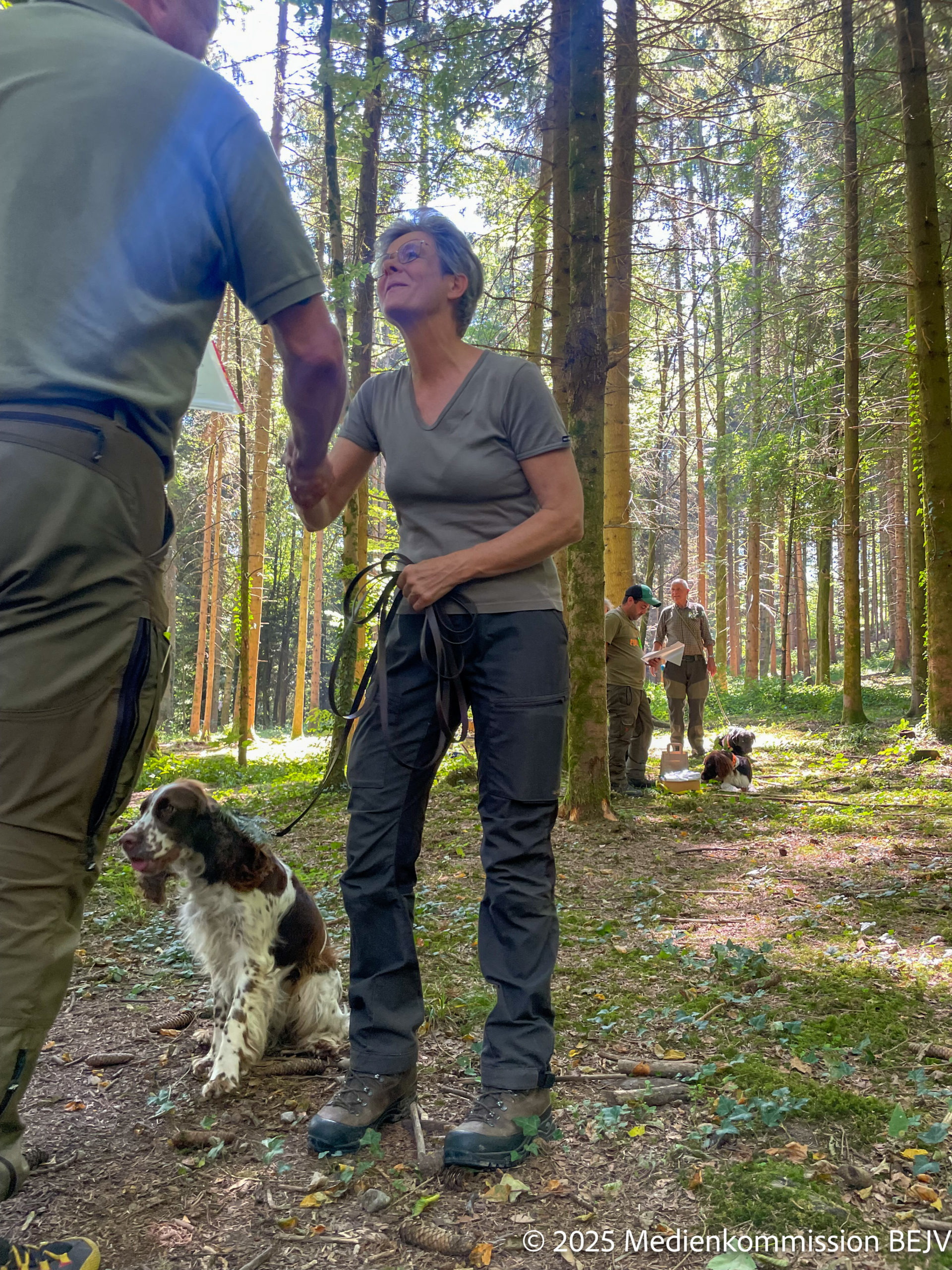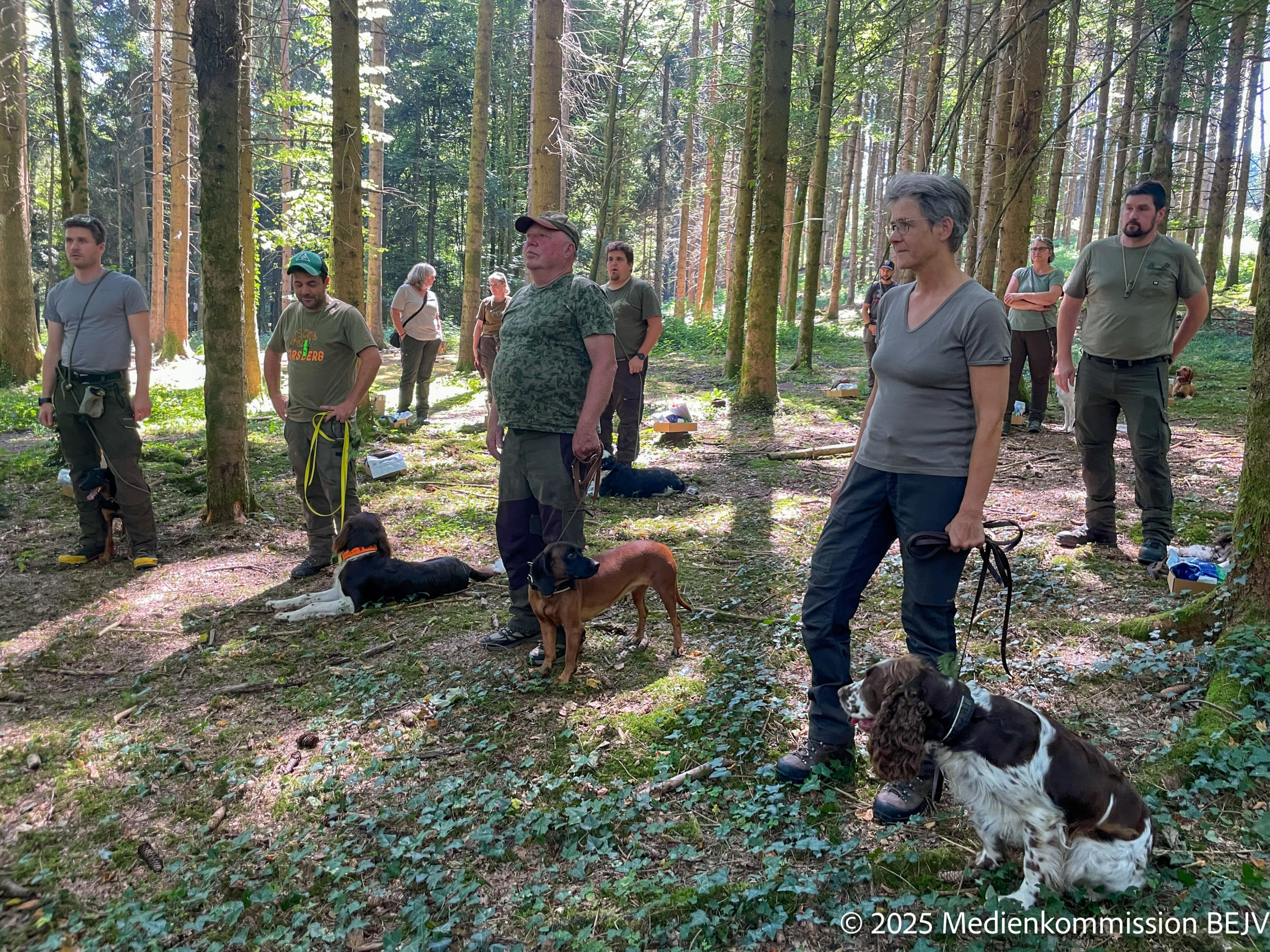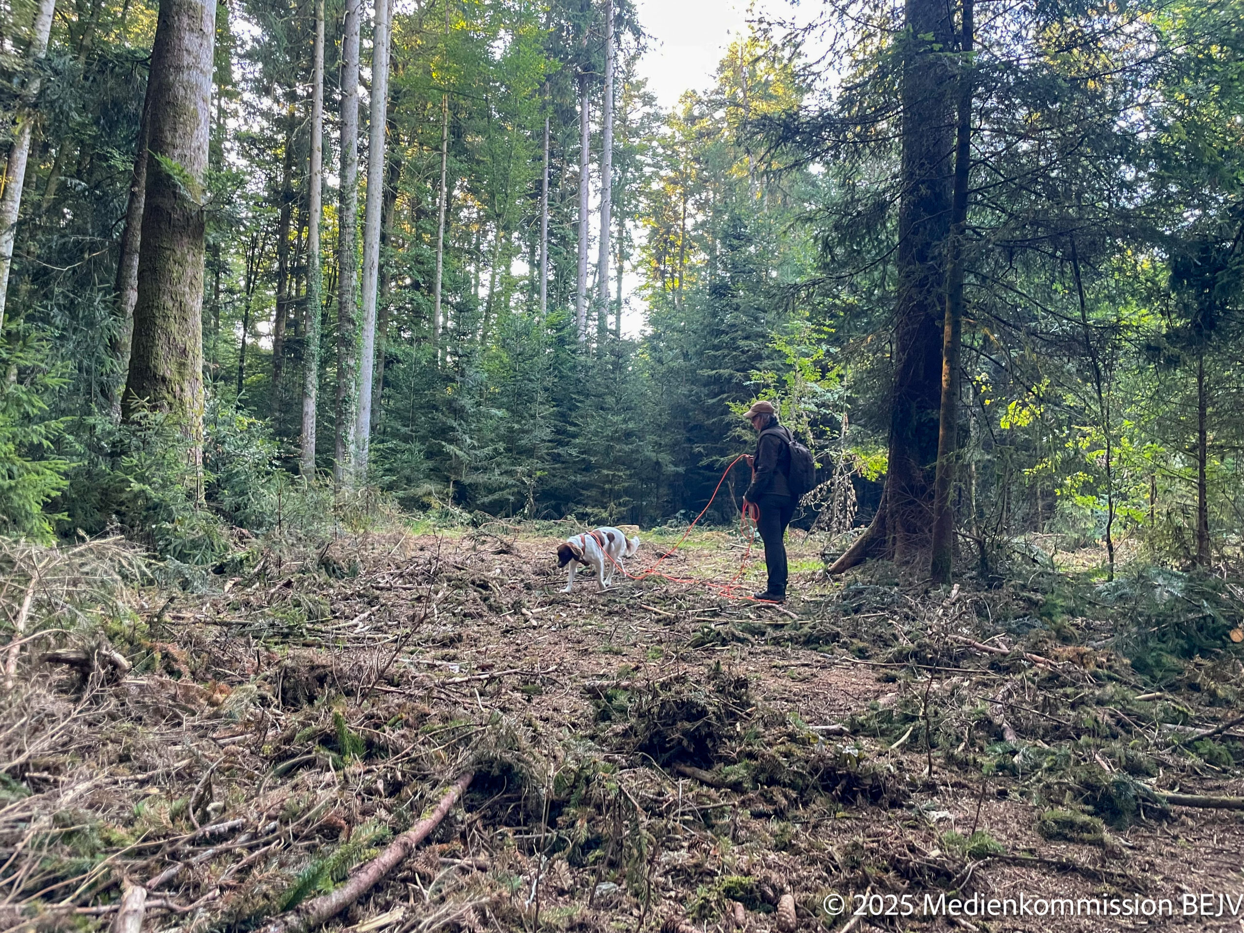 Innerhalb der Prüfungsgruppe haben die Richter anschliessend die elektronische Kennzeichnung (Mikrochip) geprüft und die Teilnehmenden verschoben in das Prüfungsgelände. Seit 2025 ist eine neue Prüfungsordnung für Schweisshundeprüfungen der Technischen Kommission für das Jagdhundewesen (TKJ) in Kraft. Unter anderem müssen die Gespanne neu eine Vorsuche auf einer markierten Fläche von ca. 30 x 30 m durchführen, wobei der Abgang selbst gefunden werden muss. Die Richterinnen und Richter haben lediglich eingewiesen und die ungefähre Richtung des abgehenden, verwundeten Stücks angegeben.