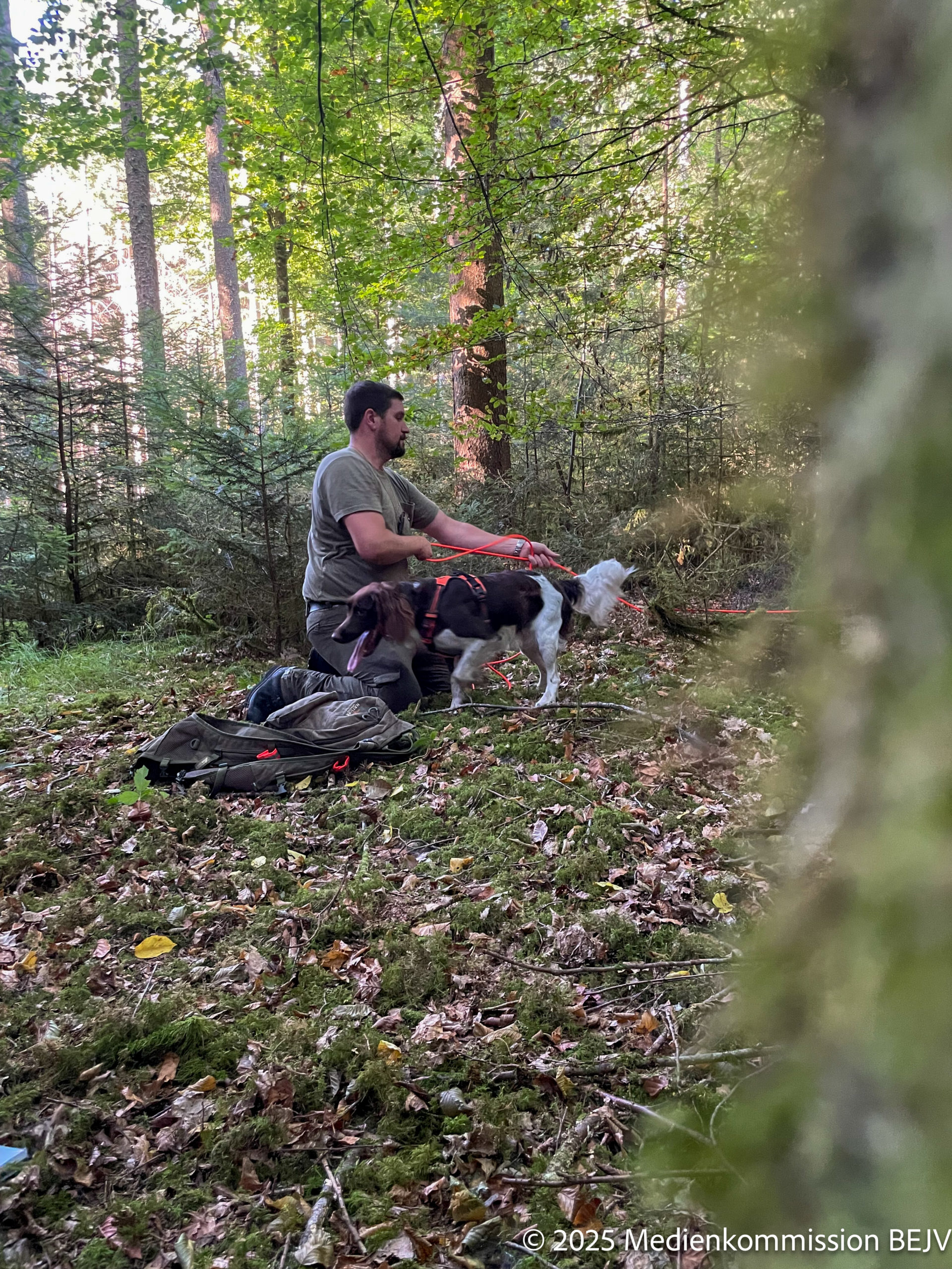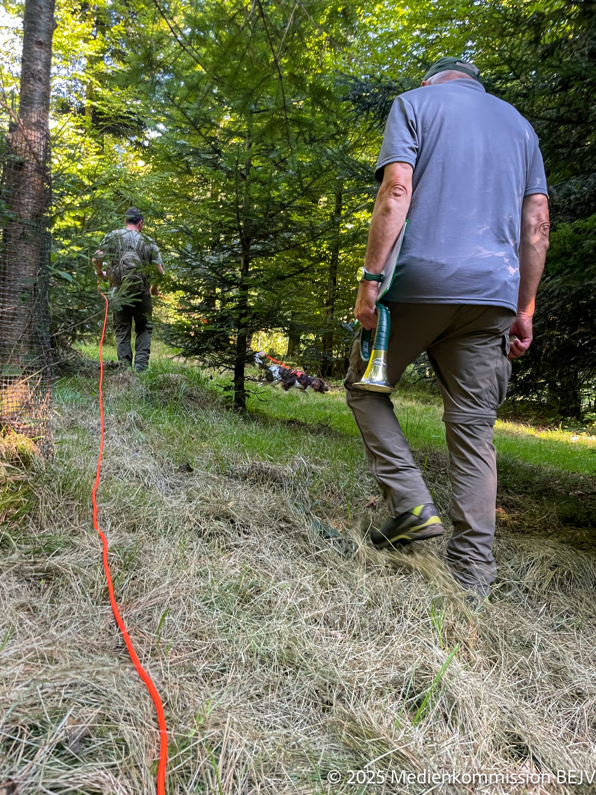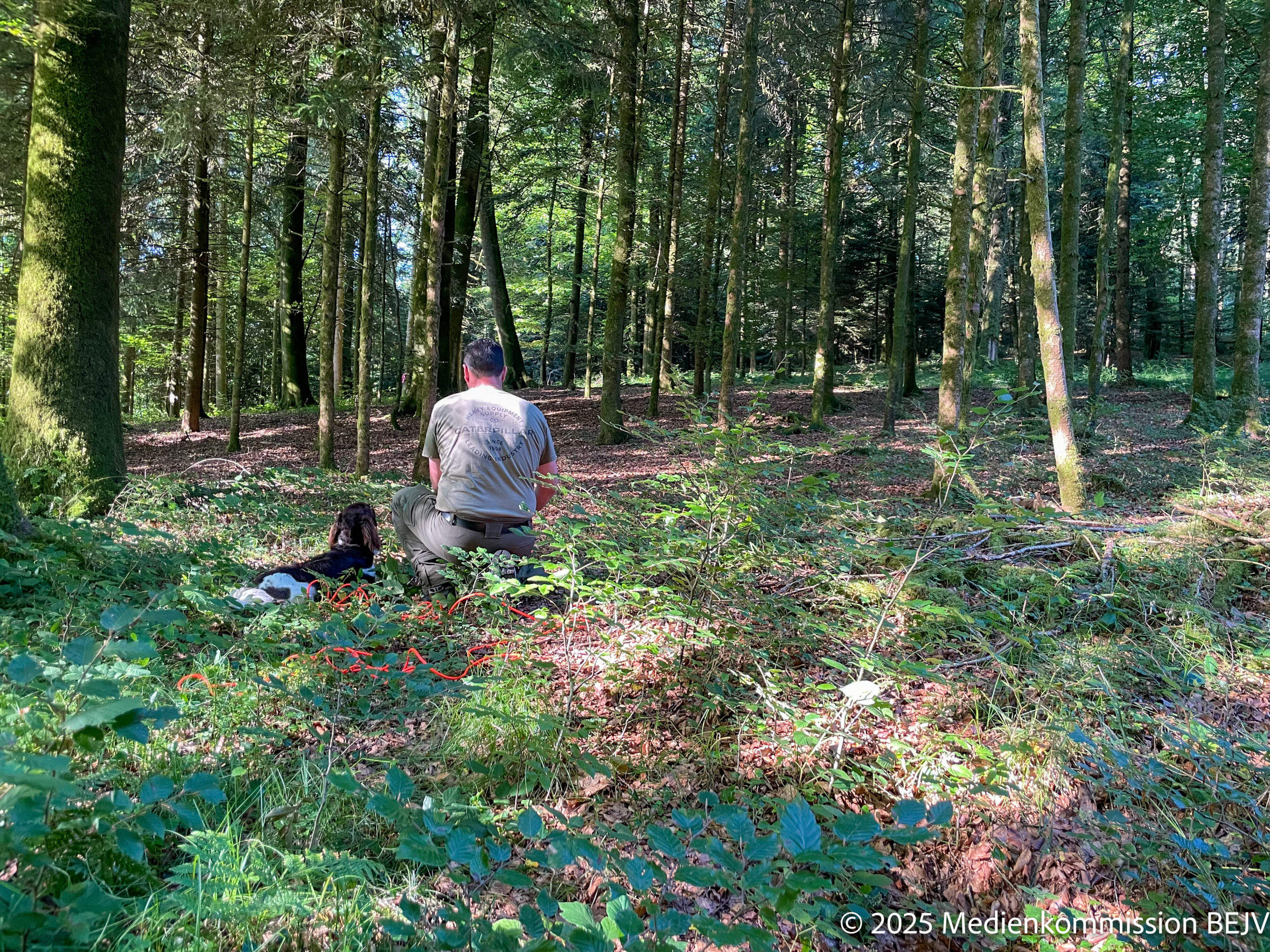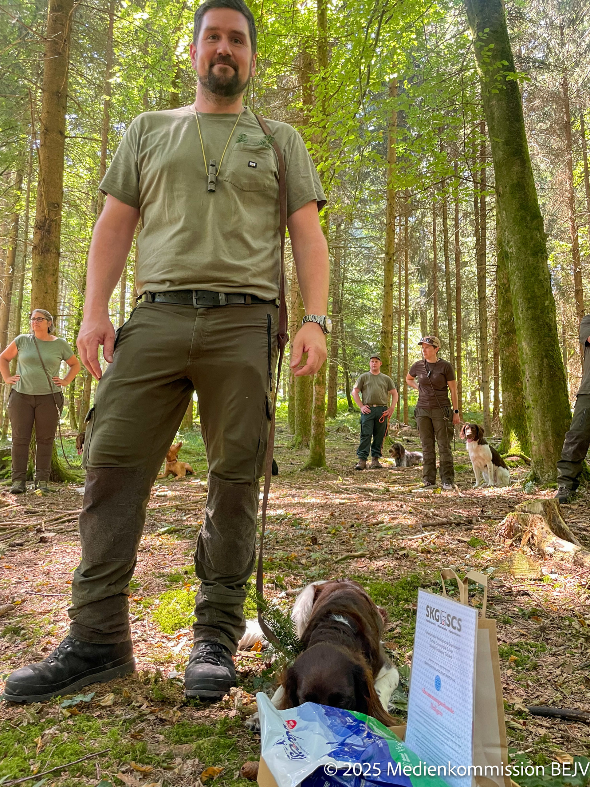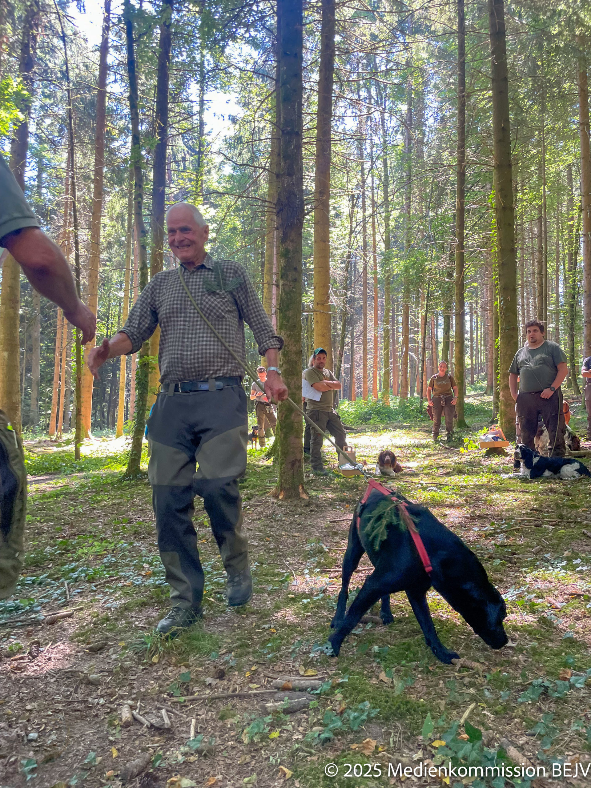 Innerhalb der Prüfungsgruppe haben die Richter anschliessend die elektronische Kennzeichnung (Mikrochip) geprüft und die Teilnehmenden verschoben in das Prüfungsgelände. Seit 2025 ist eine neue Prüfungsordnung für Schweisshundeprüfungen der Technischen Kommission für das Jagdhundewesen (TKJ) in Kraft. Unter anderem müssen die Gespanne neu eine Vorsuche auf einer markierten Fläche von ca. 30 x 30 m durchführen, wobei der Abgang selbst gefunden werden muss. Die Richterinnen und Richter haben lediglich eingewiesen und die ungefähre Richtung des abgehenden, verwundeten Stücks angegeben.
