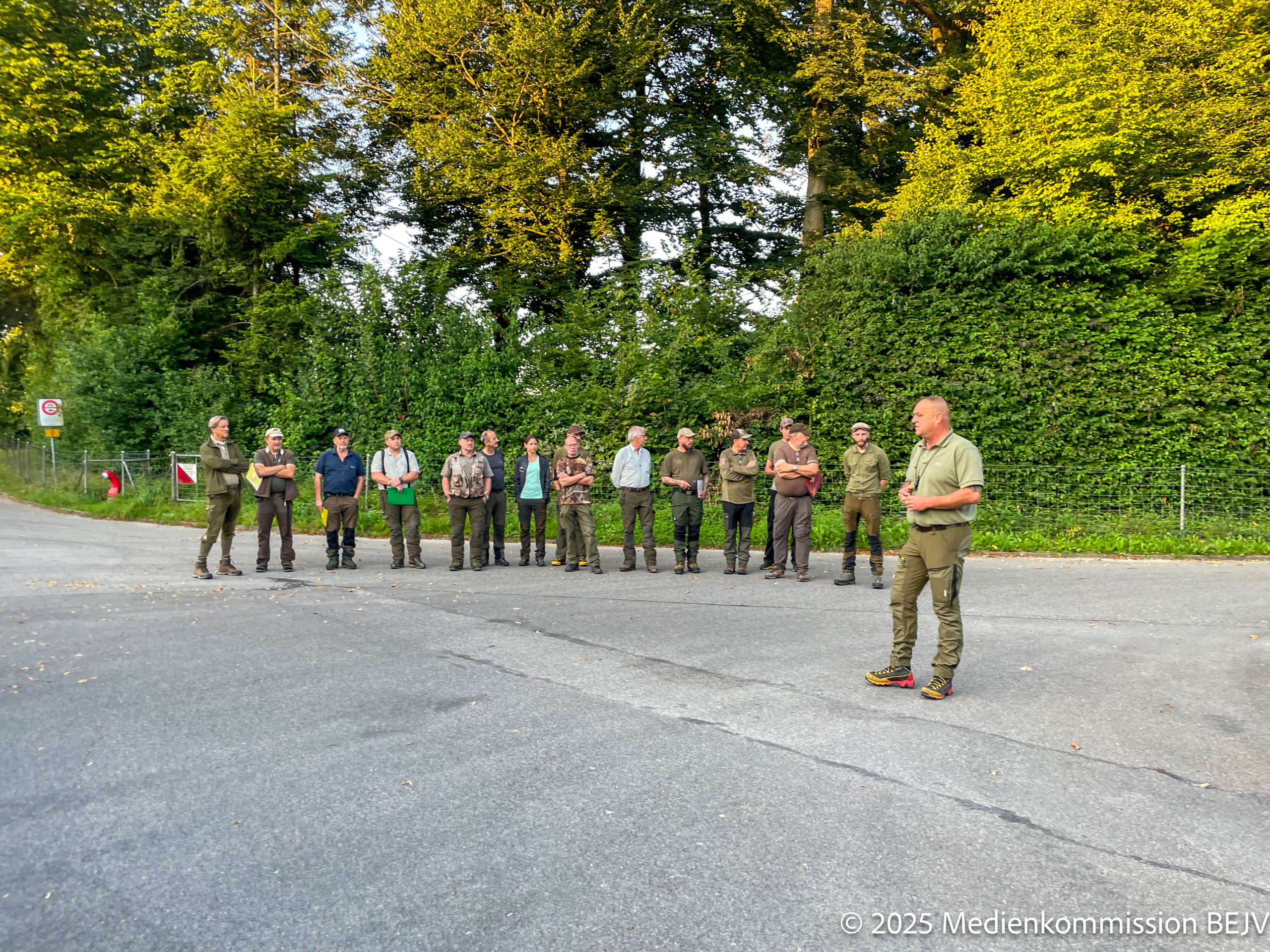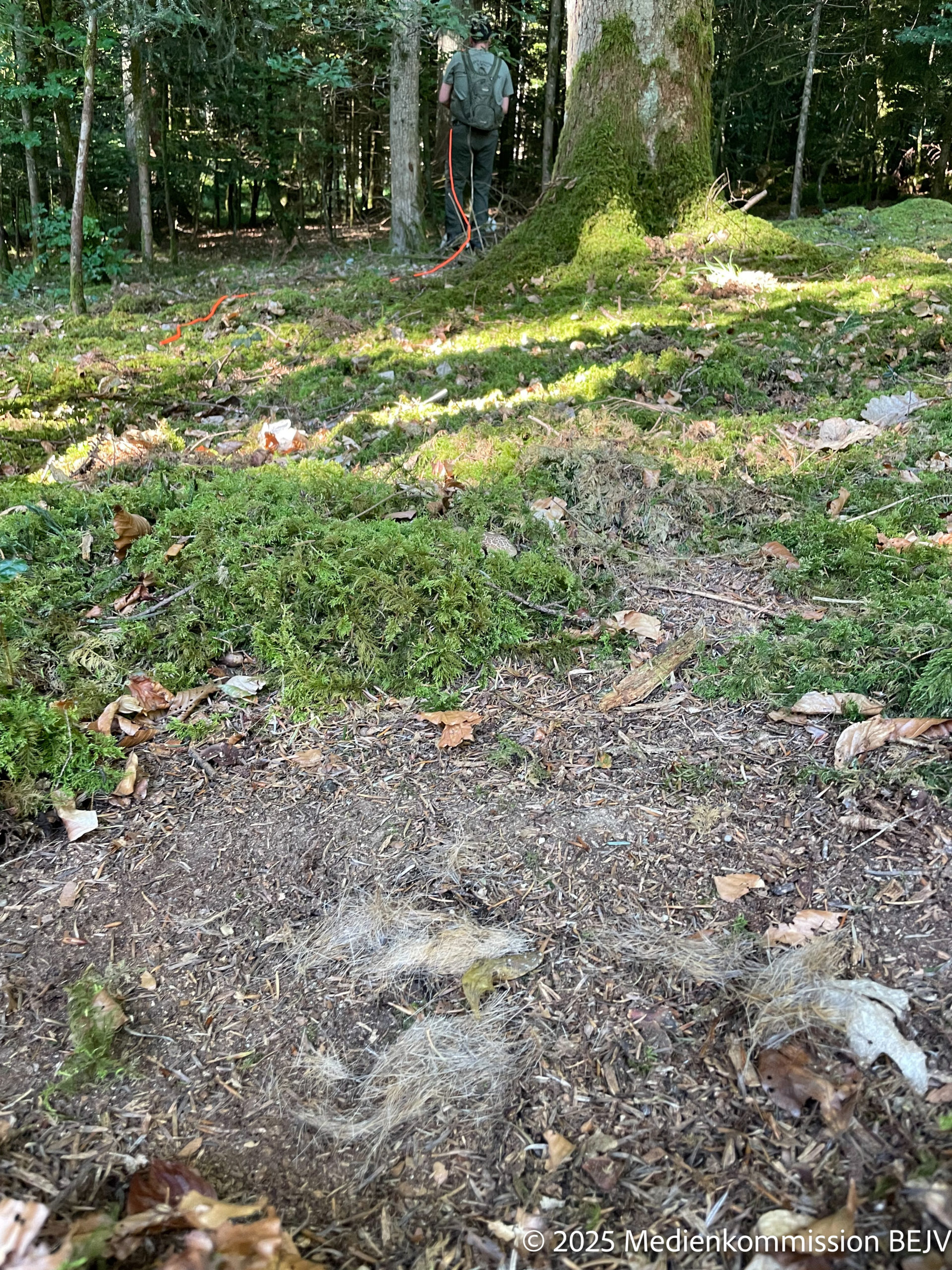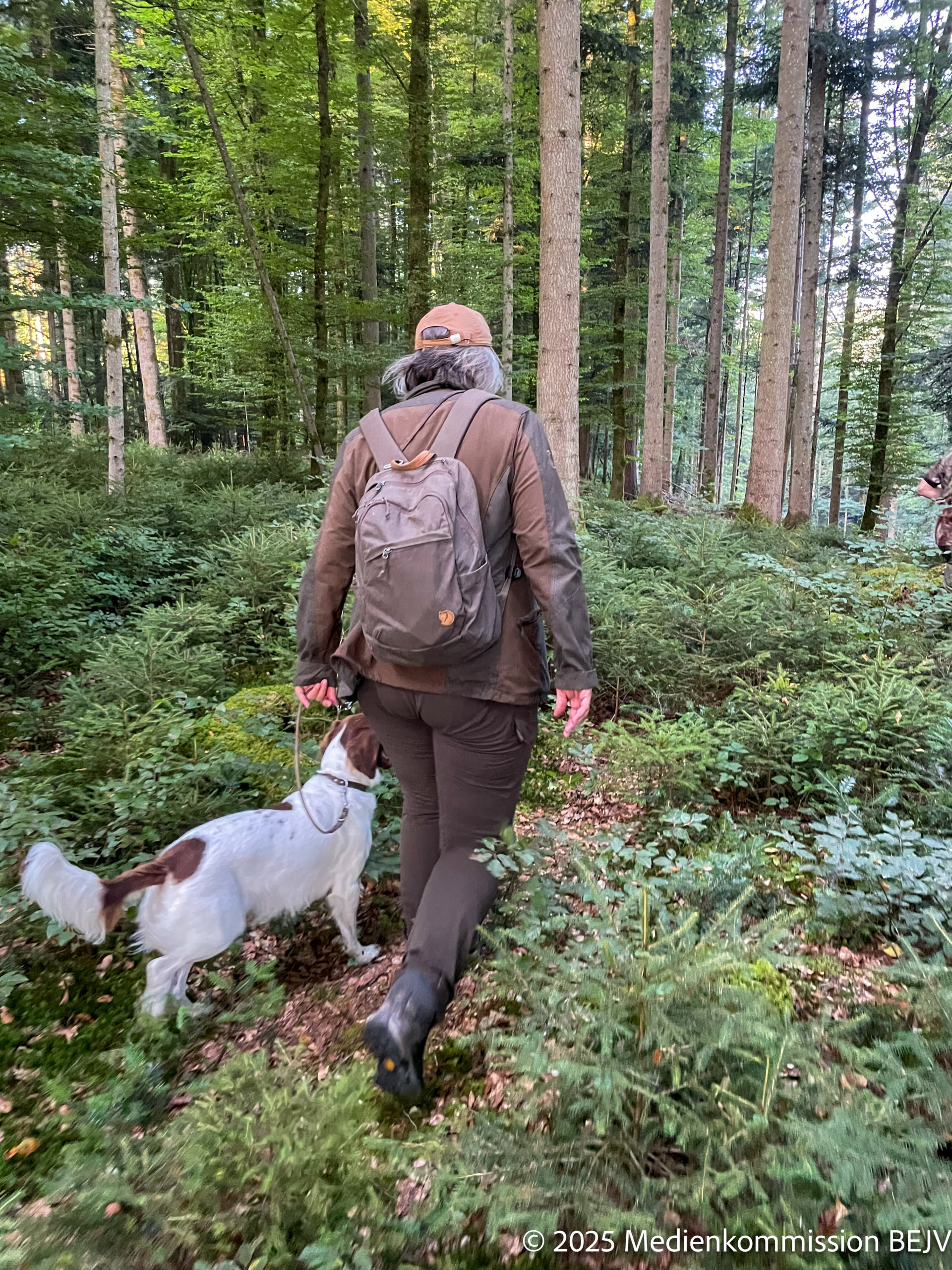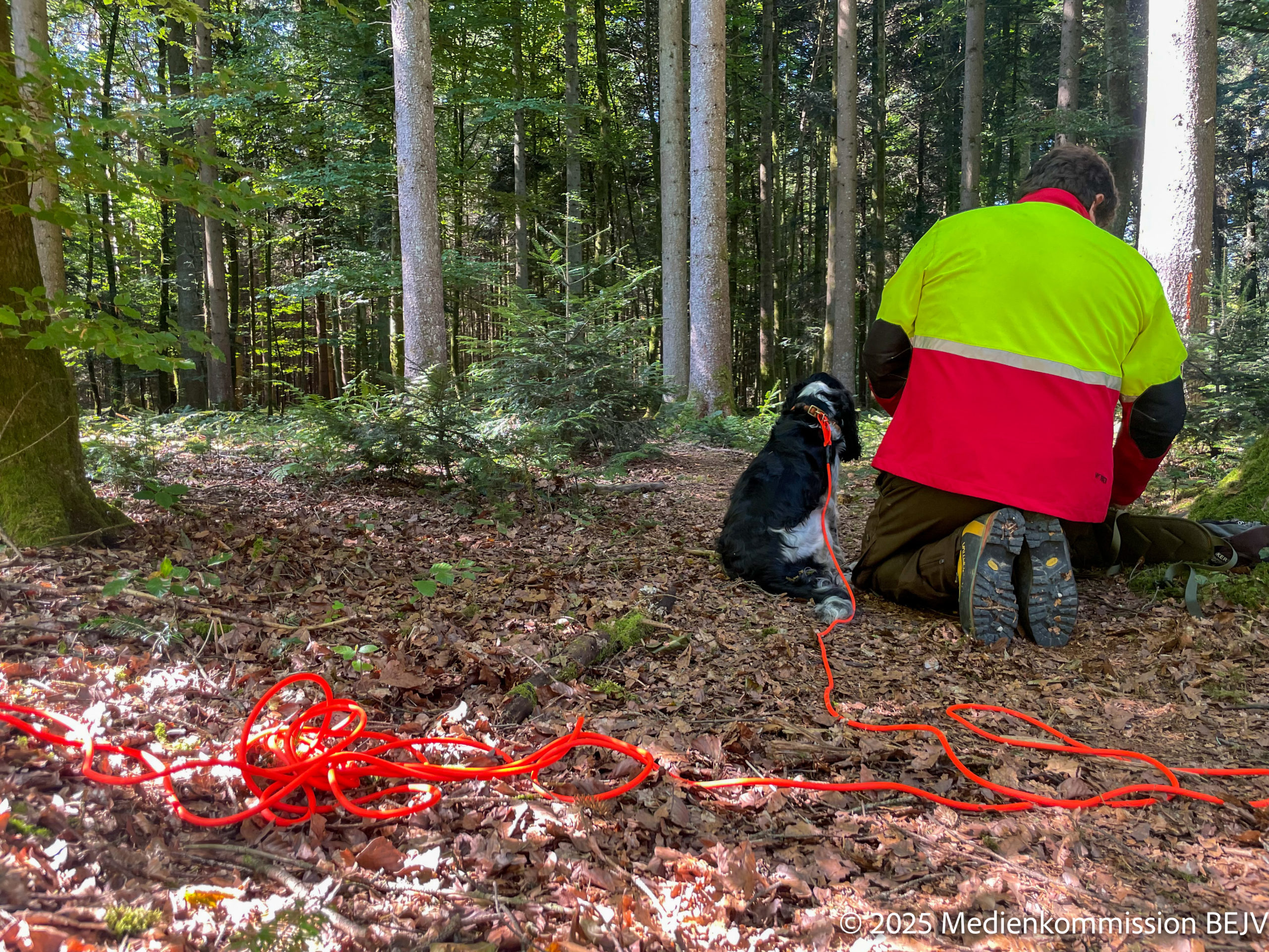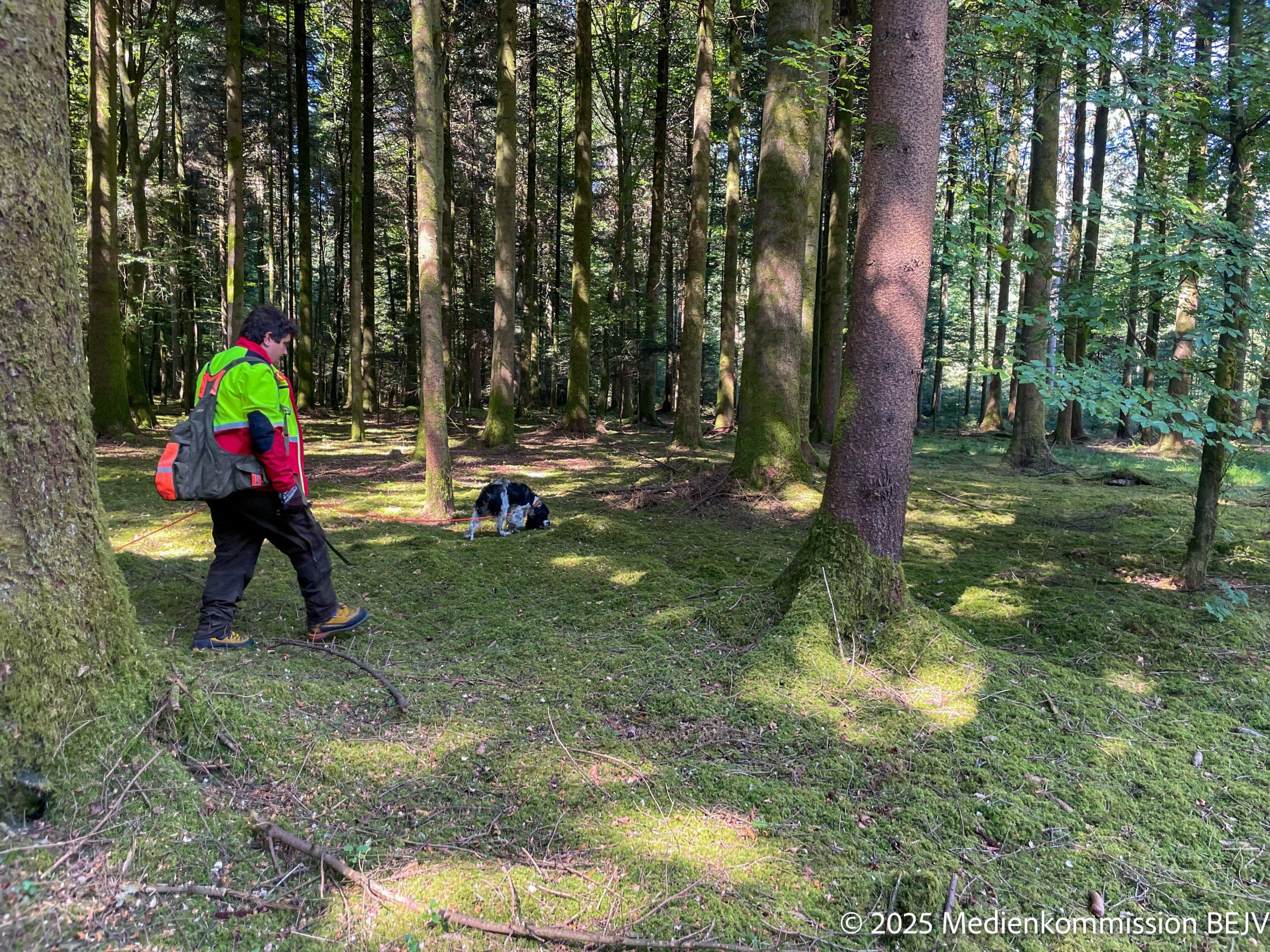Innerhalb der Prüfungsgruppe haben die Richter anschliessend die elektronische Kennzeichnung (Mikrochip) geprüft und die Teilnehmenden verschoben in das Prüfungsgelände. Seit 2025 ist eine neue Prüfungsordnung für Schweisshundeprüfungen der Technischen Kommission für das Jagdhundewesen (TKJ) in Kraft. Unter anderem müssen die Gespanne neu eine Vorsuche auf einer markierten Fläche von ca. 30 x 30 m durchführen, wobei der Abgang selbst gefunden werden muss. Die Richterinnen und Richter haben lediglich eingewiesen und die ungefähre Richtung des abgehenden, verwundeten Stücks angegeben.
