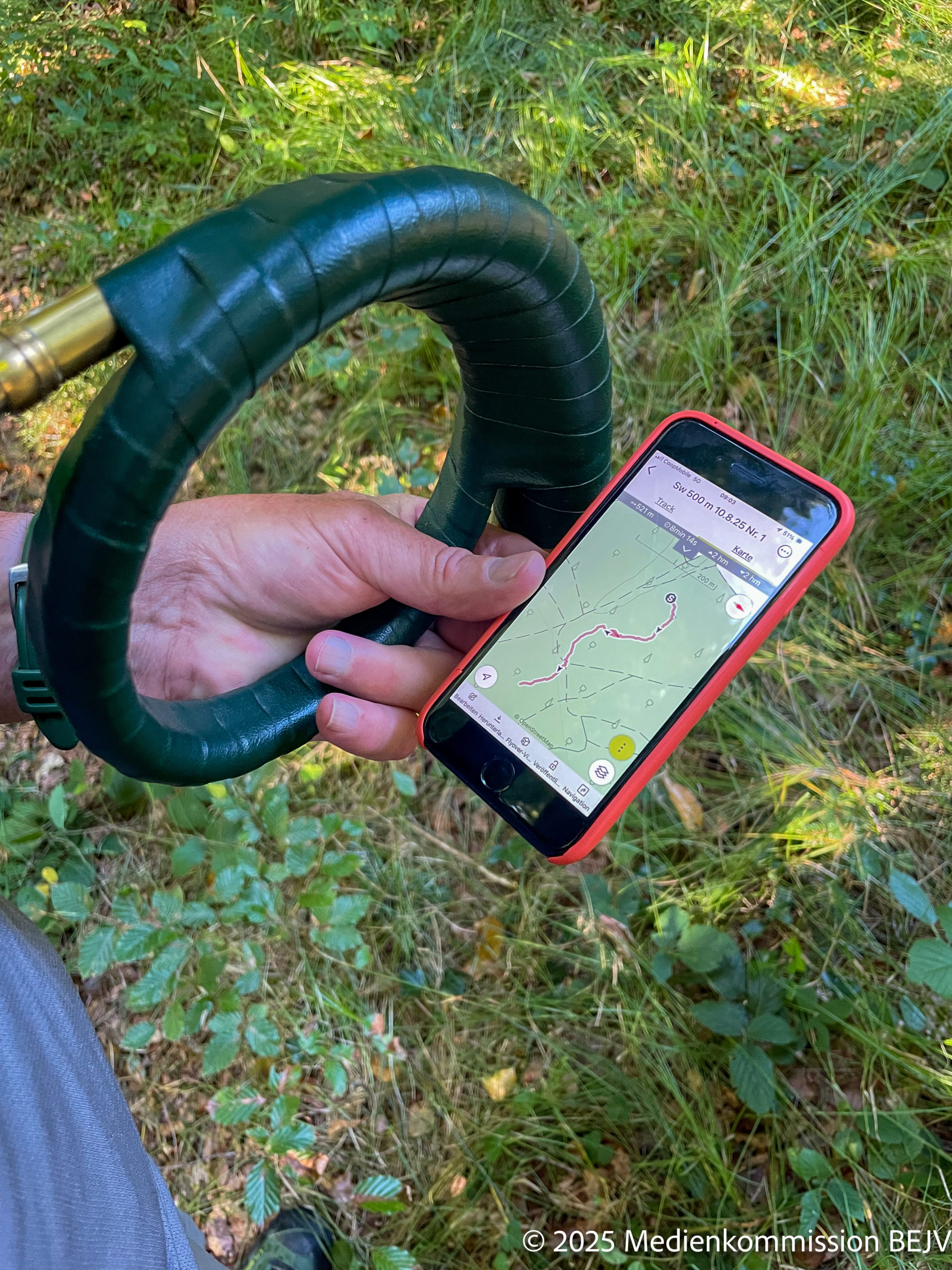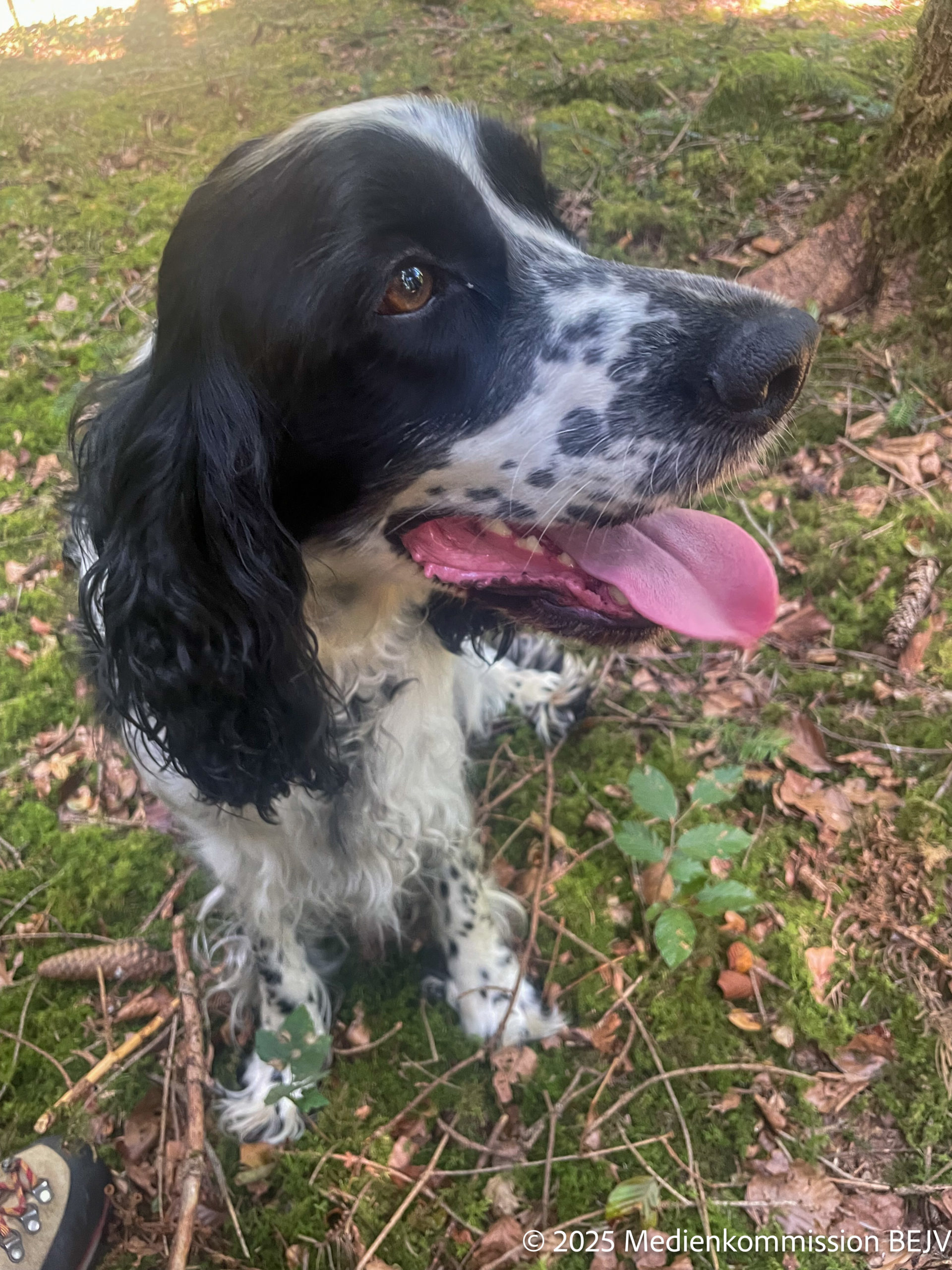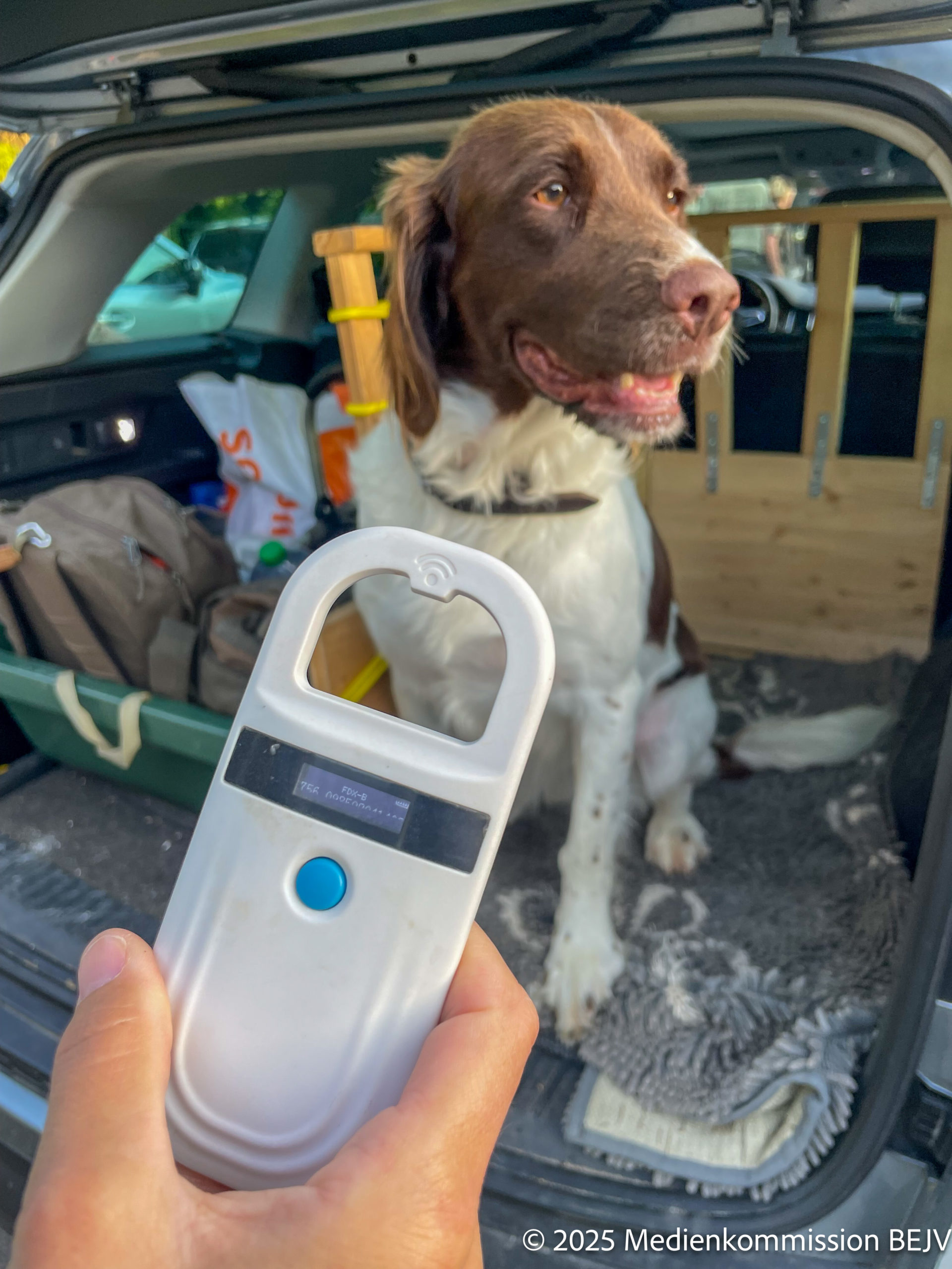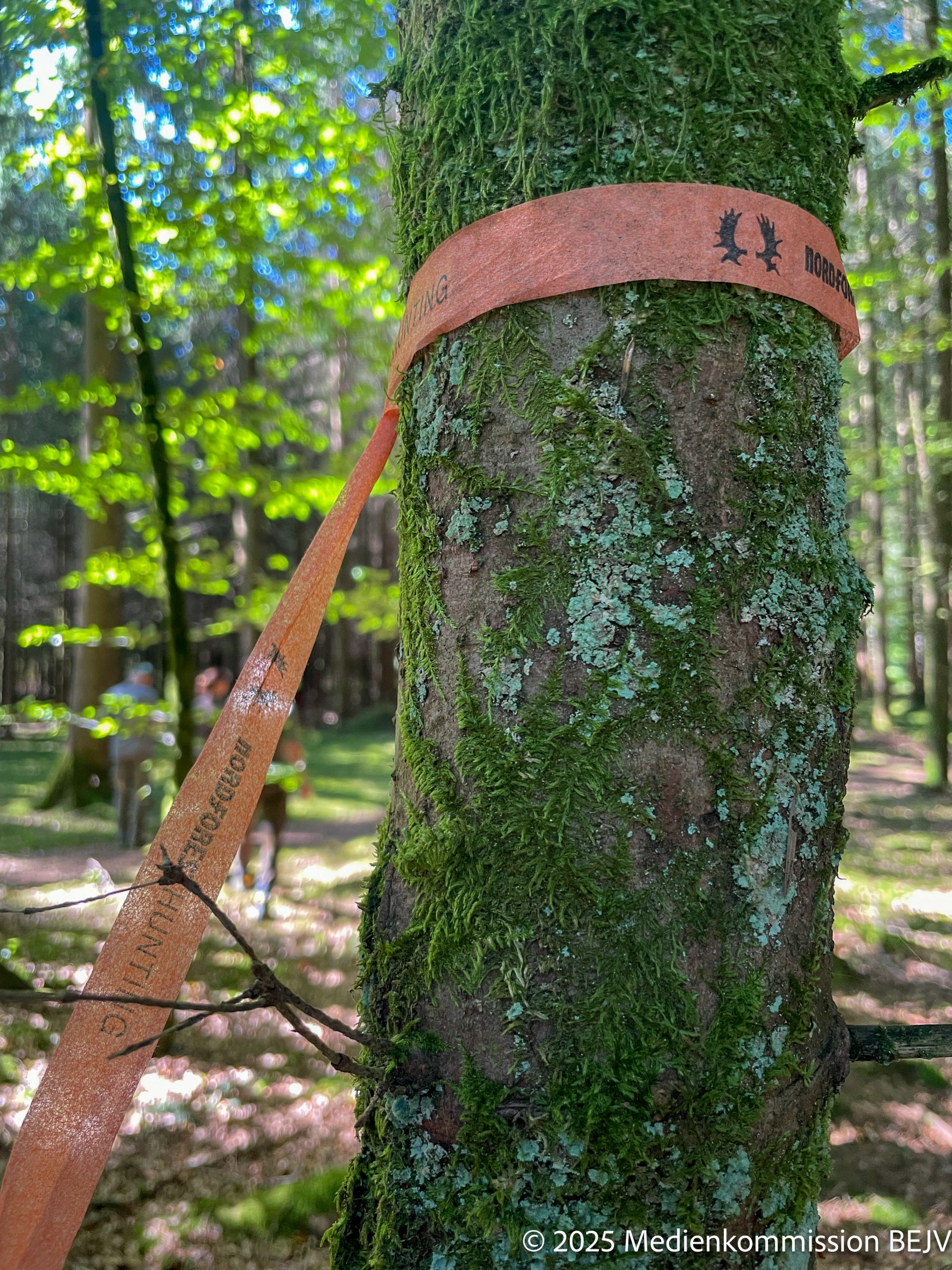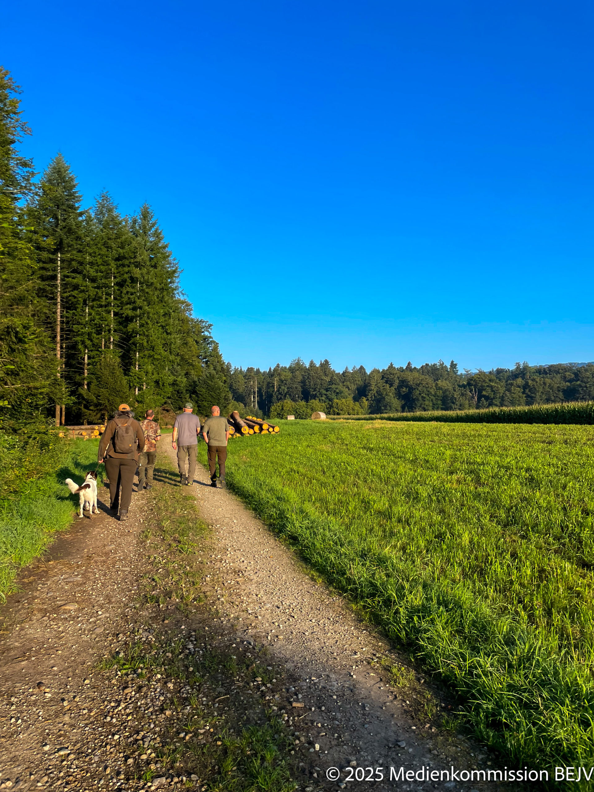 Innerhalb der Prüfungsgruppe haben die Richter anschliessend die elektronische Kennzeichnung (Mikrochip) geprüft und die Teilnehmenden verschoben in das Prüfungsgelände. Seit 2025 ist eine neue Prüfungsordnung für Schweisshundeprüfungen der Technischen Kommission für das Jagdhundewesen (TKJ) in Kraft. Unter anderem müssen die Gespanne neu eine Vorsuche auf einer markierten Fläche von ca. 30 x 30 m durchführen, wobei der Abgang selbst gefunden werden muss. Die Richterinnen und Richter haben lediglich eingewiesen und die ungefähre Richtung des abgehenden, verwundeten Stücks angegeben.