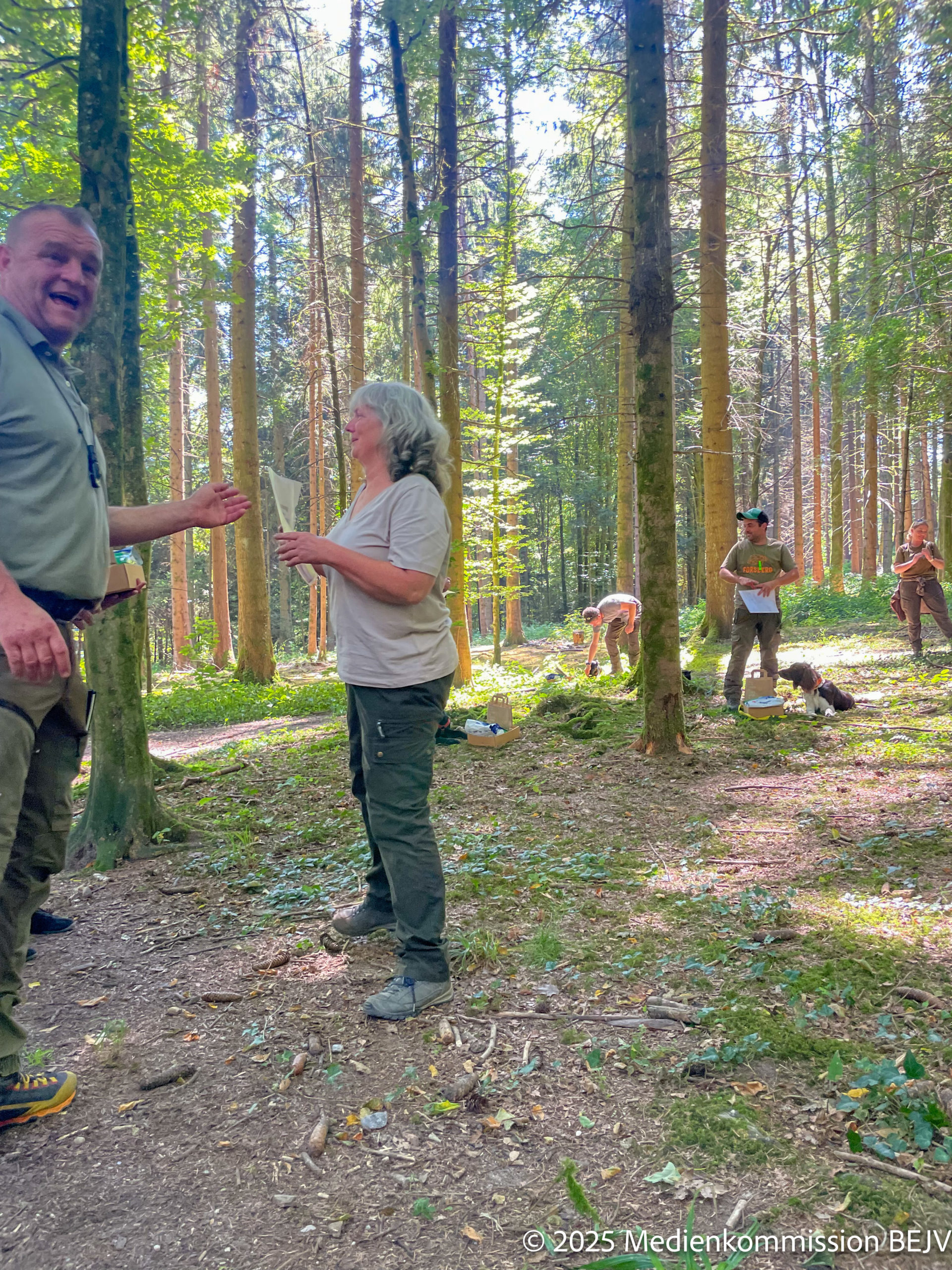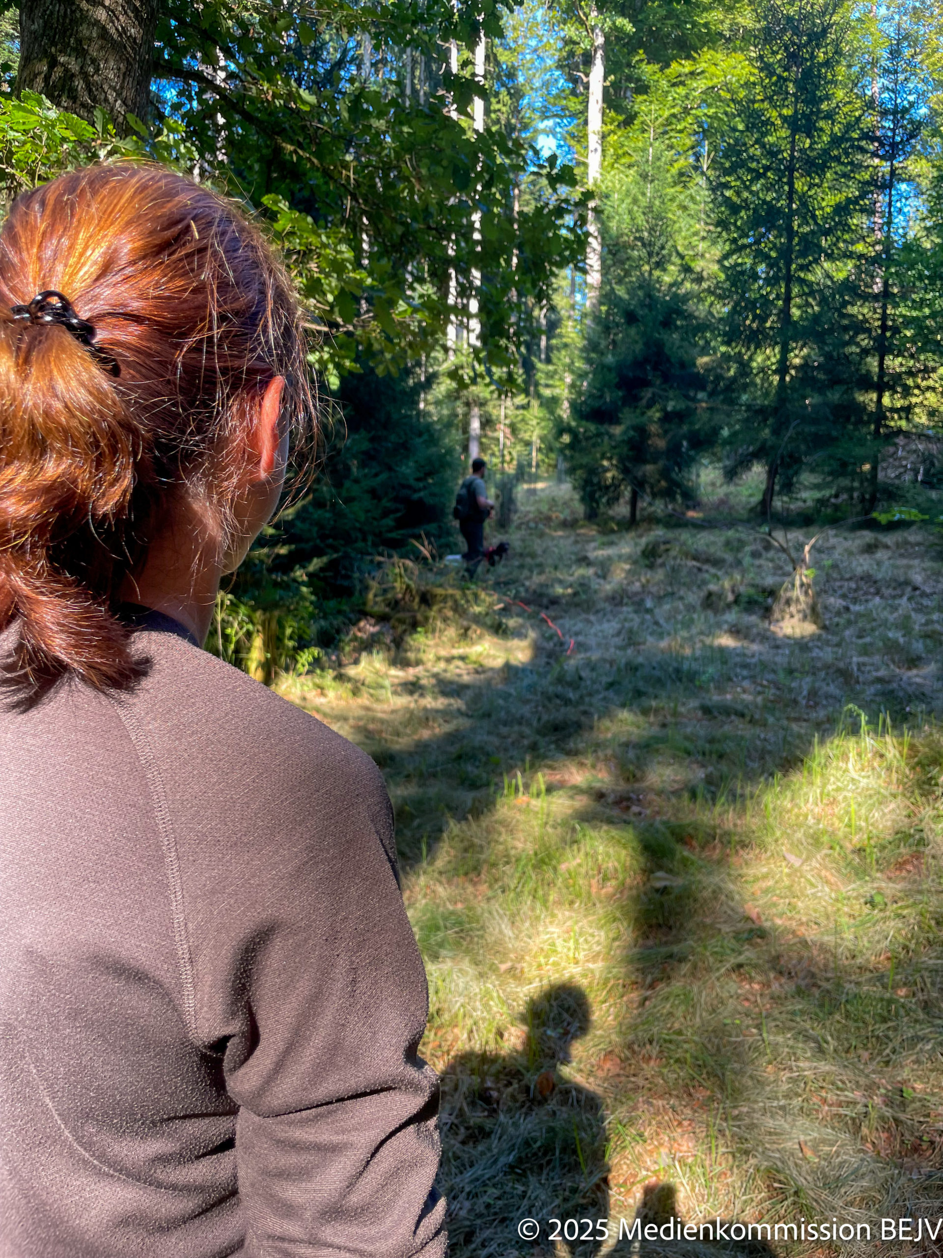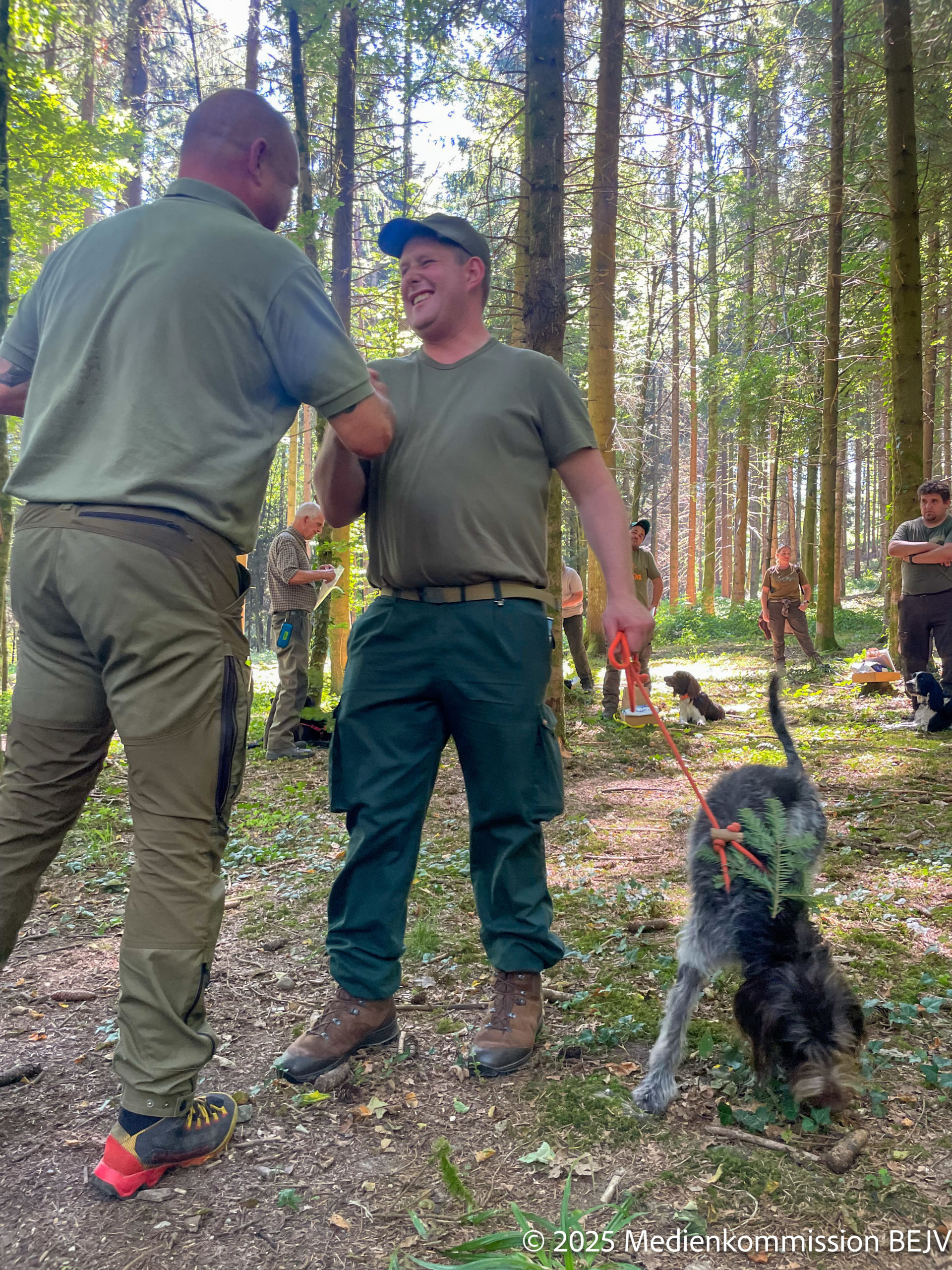 Mit dabei waren zudem eine Richteranwärterin und zwei Richteranwärter aus dem Wallis, welche so Praxiserfahrungen in einem anderen Kanton sammeln konnten. Während der Prüfung herrschten realistische Bedingungen. Spaziergänger, Biker, andere Hunde und Reiterinnen bevorzugten bei dem heissen Sommerwetter ebenfalls den kühlen Wald, um sich zu bewegen.