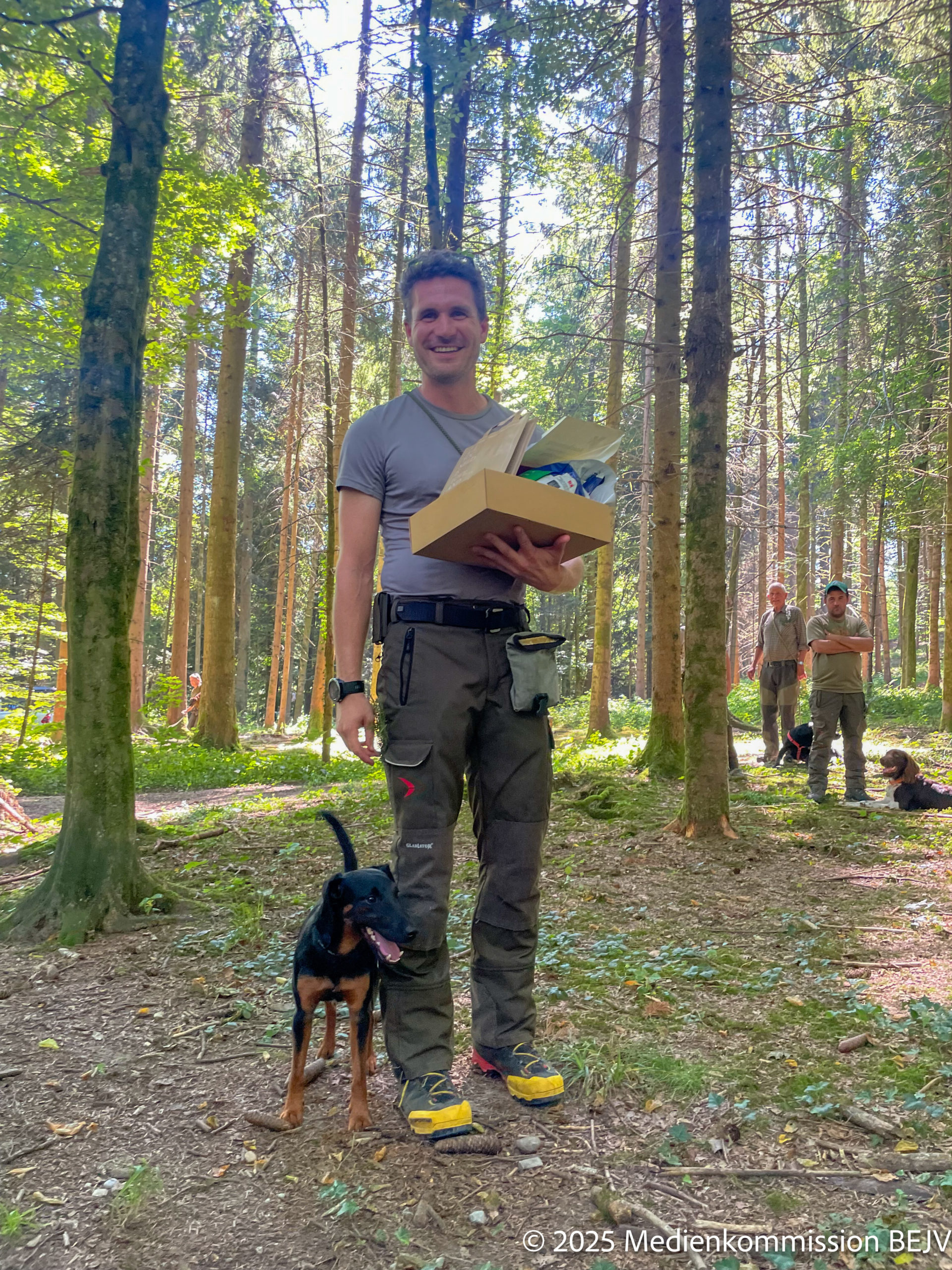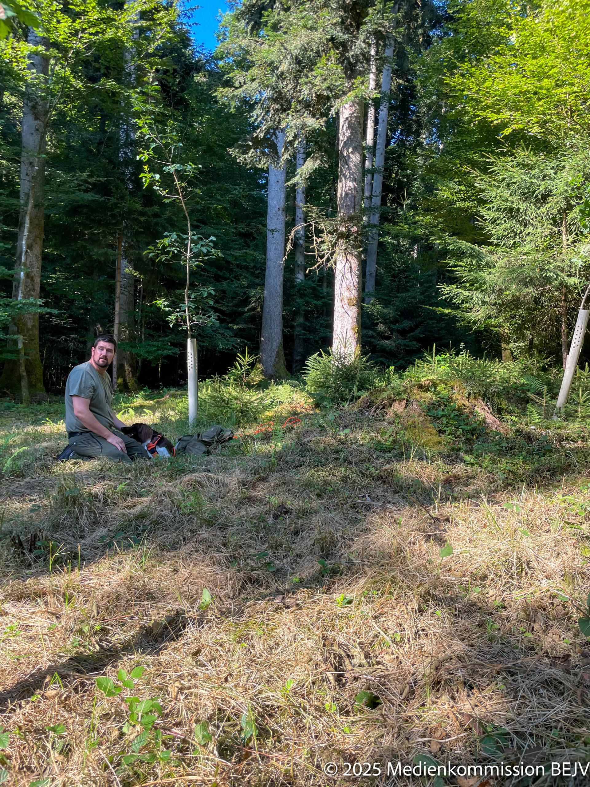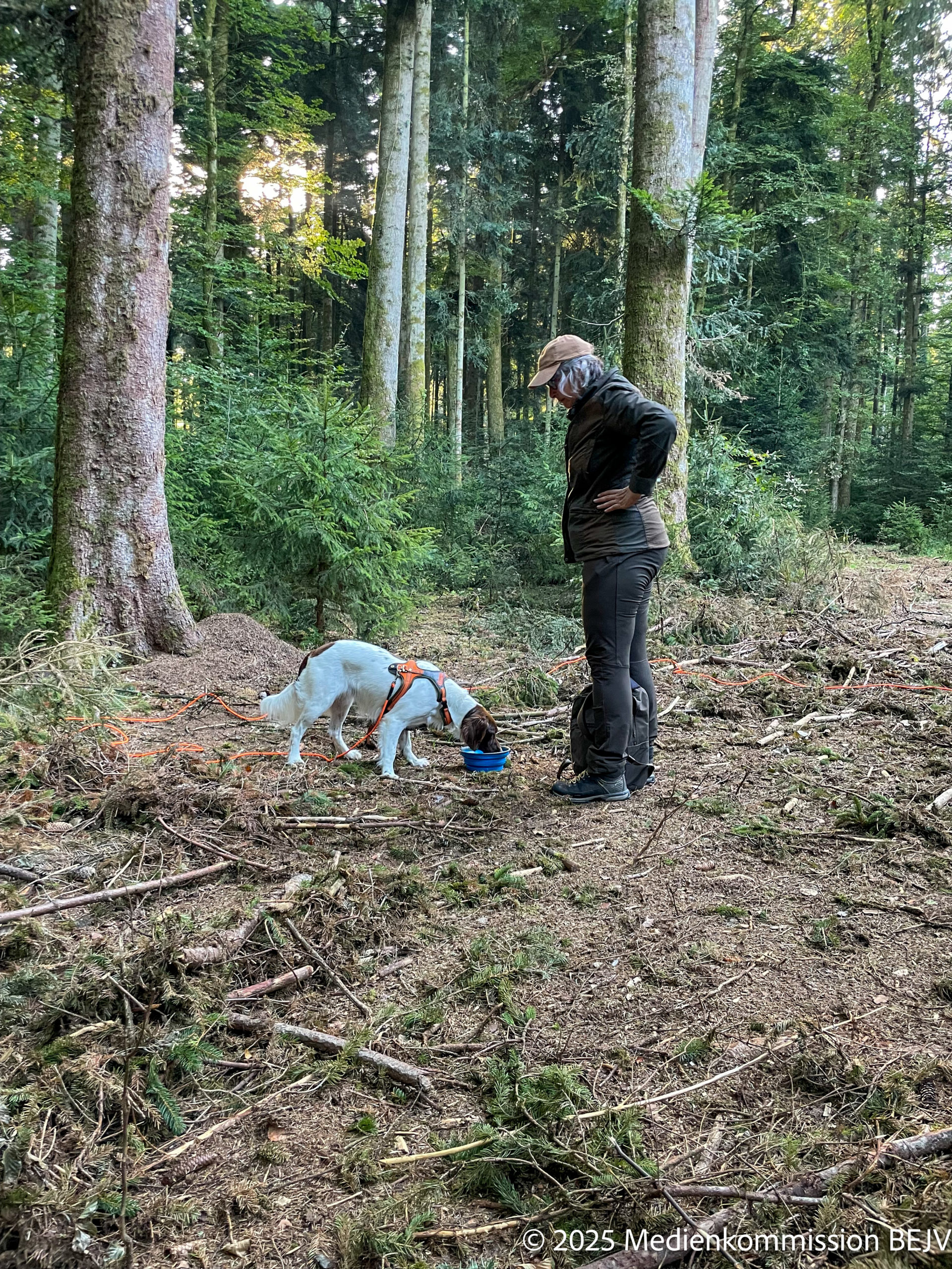 Mit dabei waren zudem eine Richteranwärterin und zwei Richteranwärter aus dem Wallis, welche so Praxiserfahrungen in einem anderen Kanton sammeln konnten. Während der Prüfung herrschten realistische Bedingungen. Spaziergänger, Biker, andere Hunde und Reiterinnen bevorzugten bei dem heissen Sommerwetter ebenfalls den kühlen Wald, um sich zu bewegen.